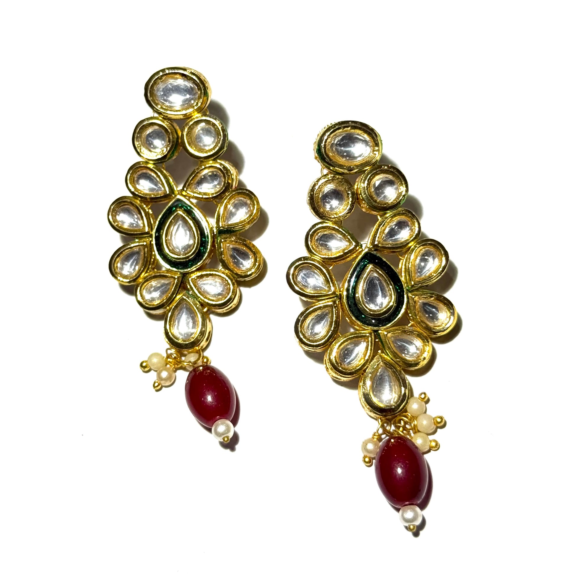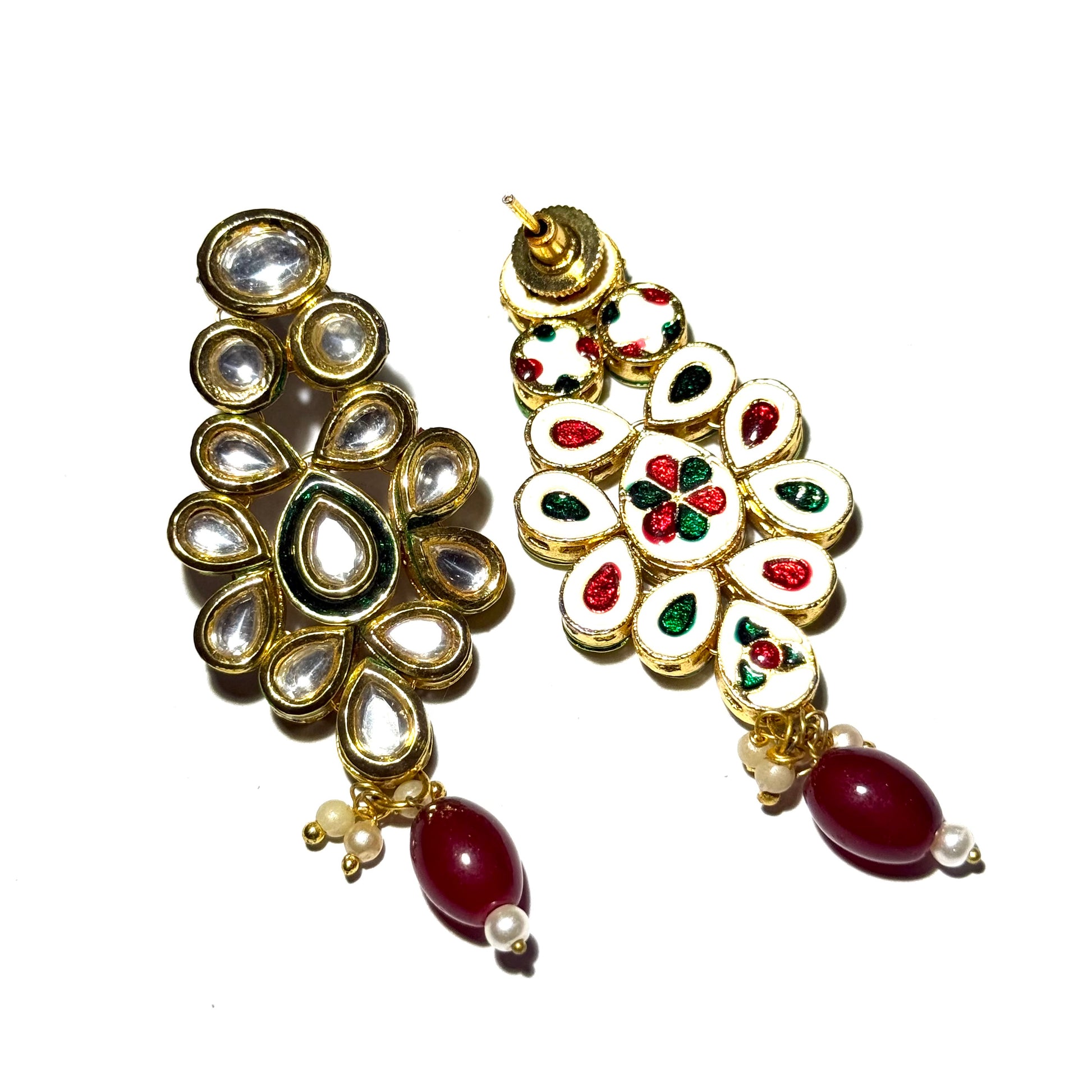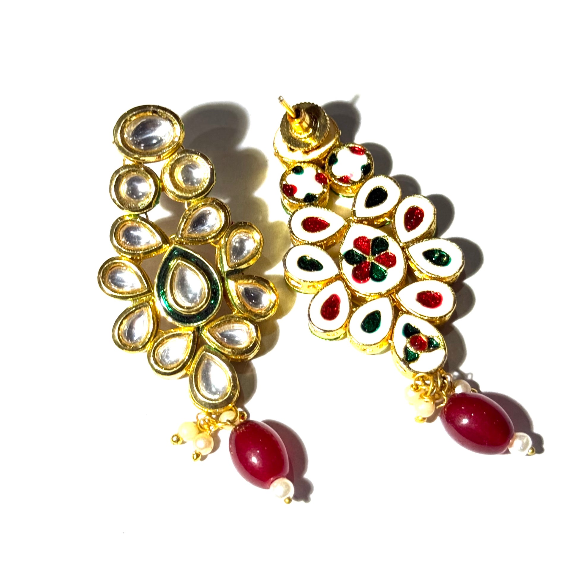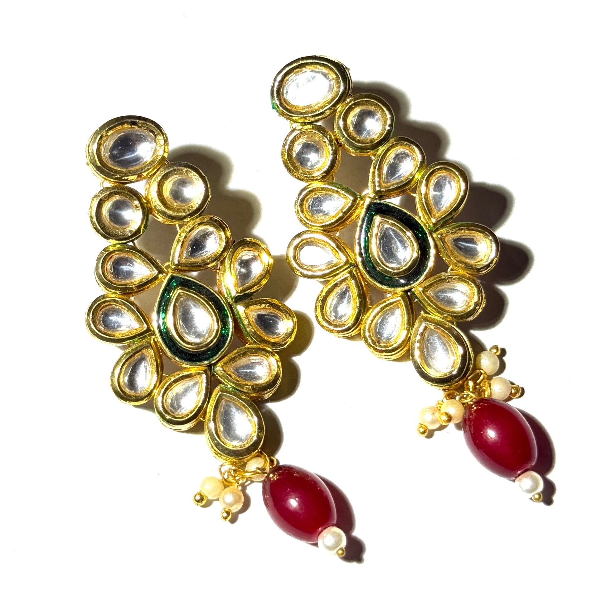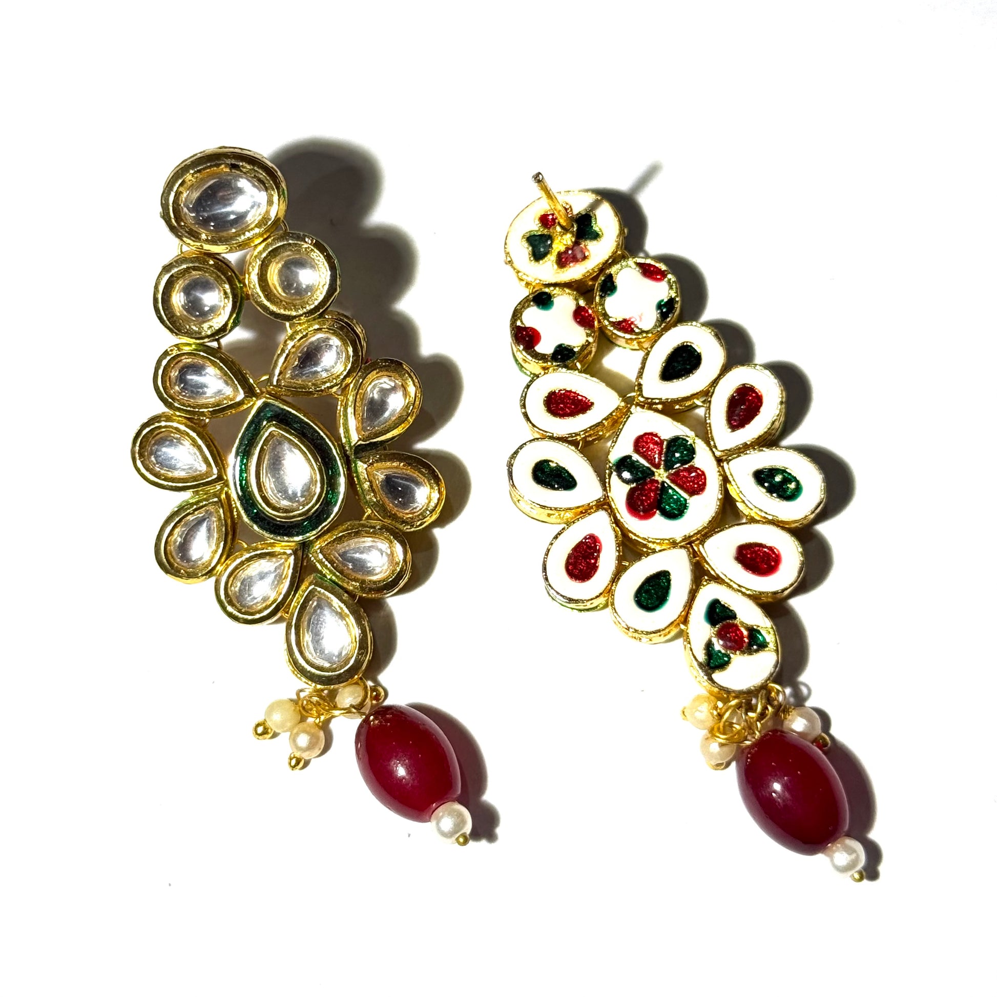Elevate your elegance with the Kundan Earrings, a stunning double-sided design featuring intricately crafted Kundan stones and emerald drops that exude timeless charm. Perfect for weddings and festive occasions, these earrings blend traditional artistry with a modern touch, making them a versatile statement piece for any wardrobe.