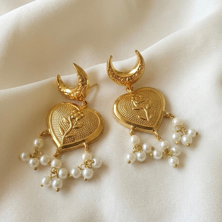 Gracefully crafted to add a touch of elegance to your festive look, these earrings feature a delicate heart-shaped stud paired with intricately designed jhumki drops. Finished in luxurious gold plating and adorned with subtle pearl danglings, they beautifully blend tradition with modern charm. Lightweight yet eye-catching, these earrings are perfect for Eid gatherings, festive celebrations, and special occasions.