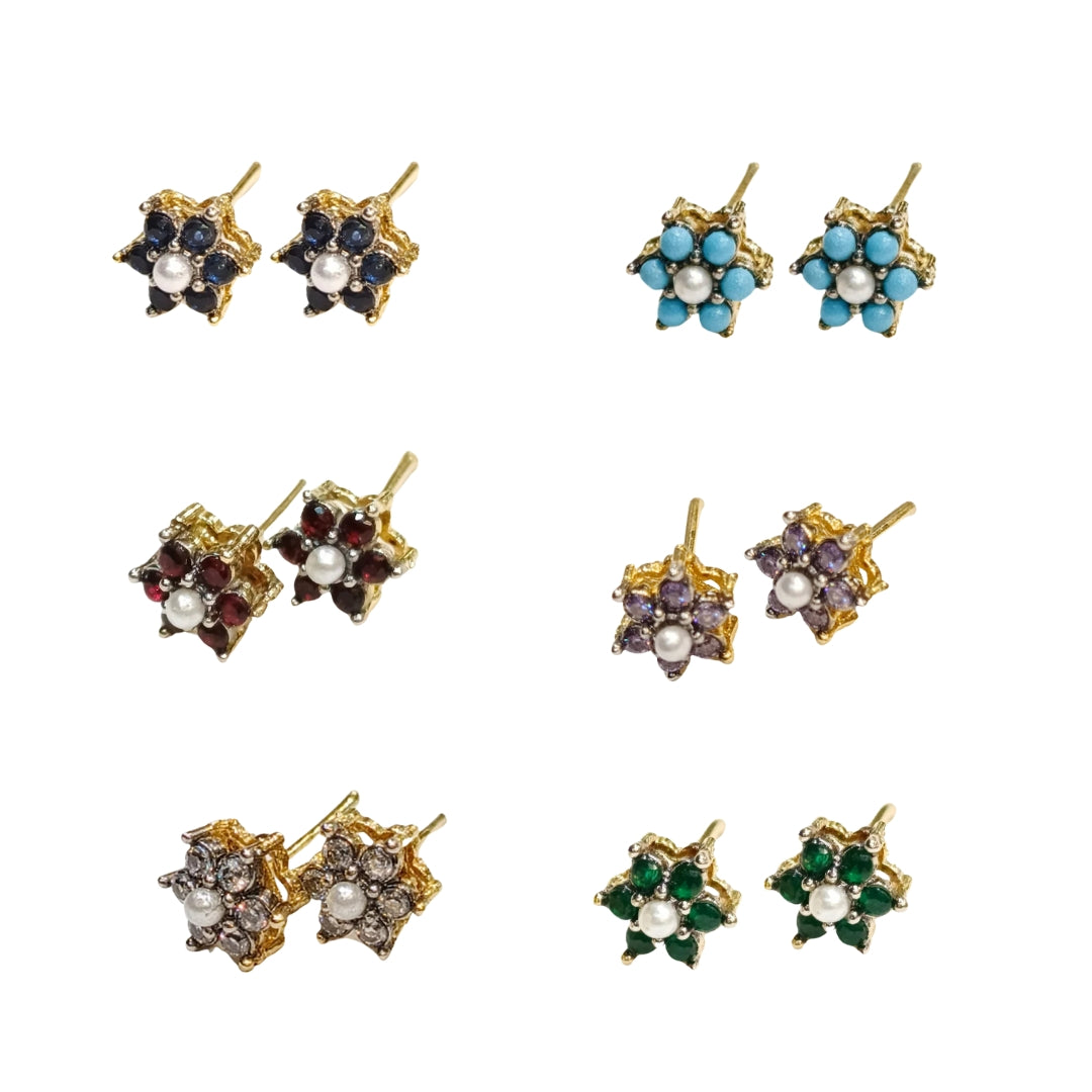 A timeless set of gold-plated floral studs, crafted with precision and elegance. Each pair features fine, sparkling stones that catch the light beautifully, making them perfect for everyday wear or subtle evening charm. With six versatile colors in one bundle, you can effortlessly match them with any outfitâwhether casual, festive, or formal. A must-have addition to your jewelry collection for effortless styling.
