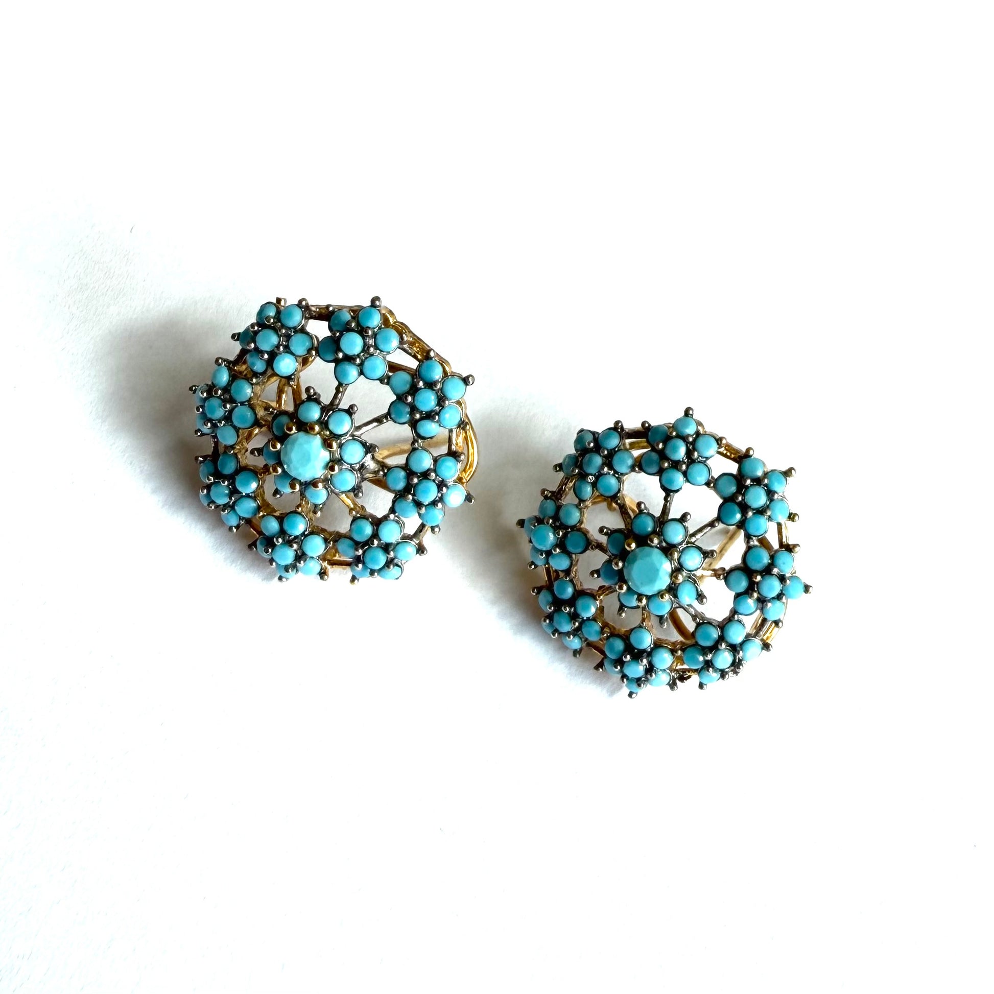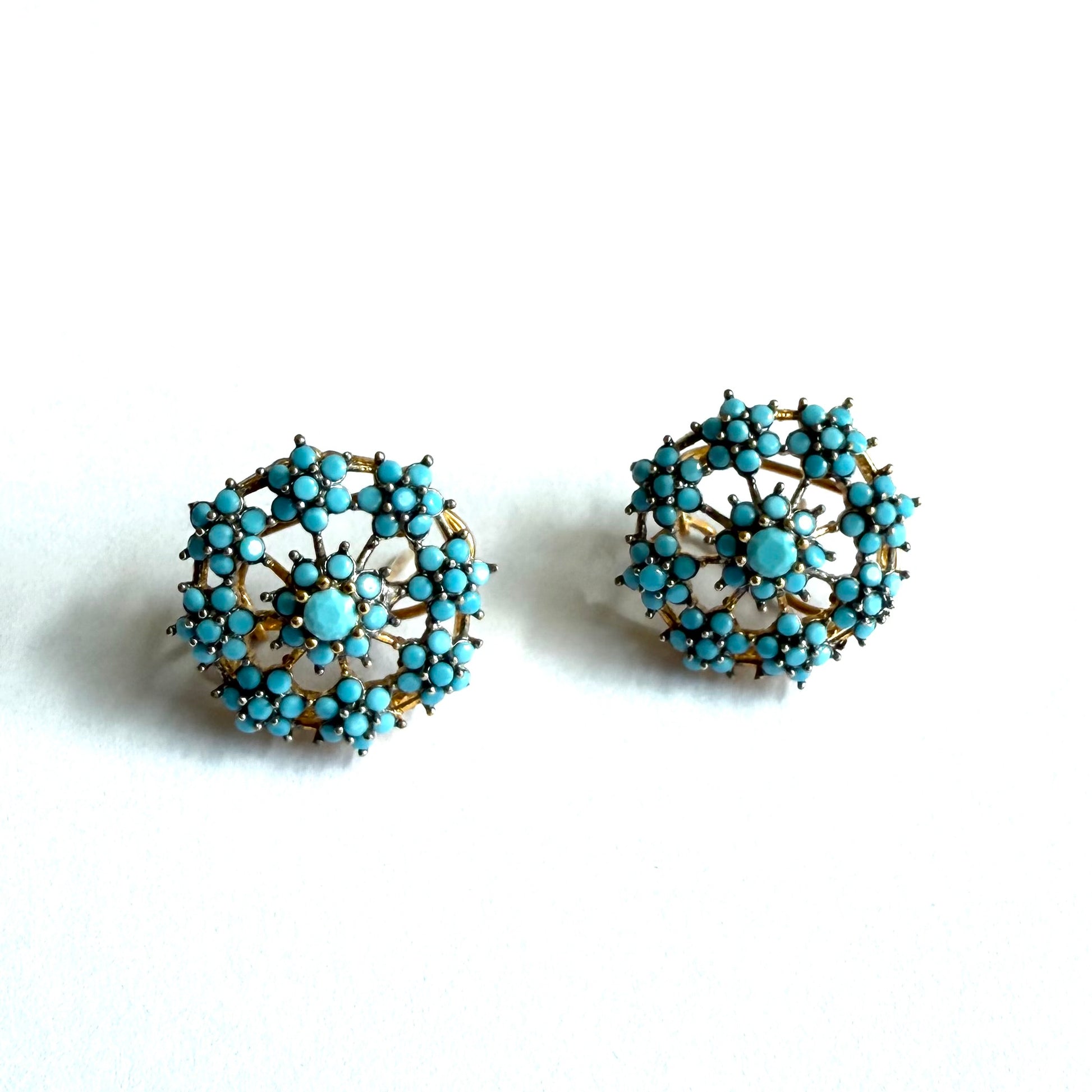 Feroza where elegance meets enchantment. These exquisite pieces feature a mesmerizing feroza stone at their core, radiating the captivating hues of a tranquil azure sky. Flanking the feroza centerpiece are shimmering zircons, delicately arranged to enhance the stone's allure with a subtle yet sparkling accent. The combination of the serene feroza and the dazzling zircons creates a spellbinding aura of sophistication and charm. With their graceful design and captivating beauty, these earrings are destined to become a cherished addition to any jewelry collection, effortlessly elevating any ensemble with their timeless allure.