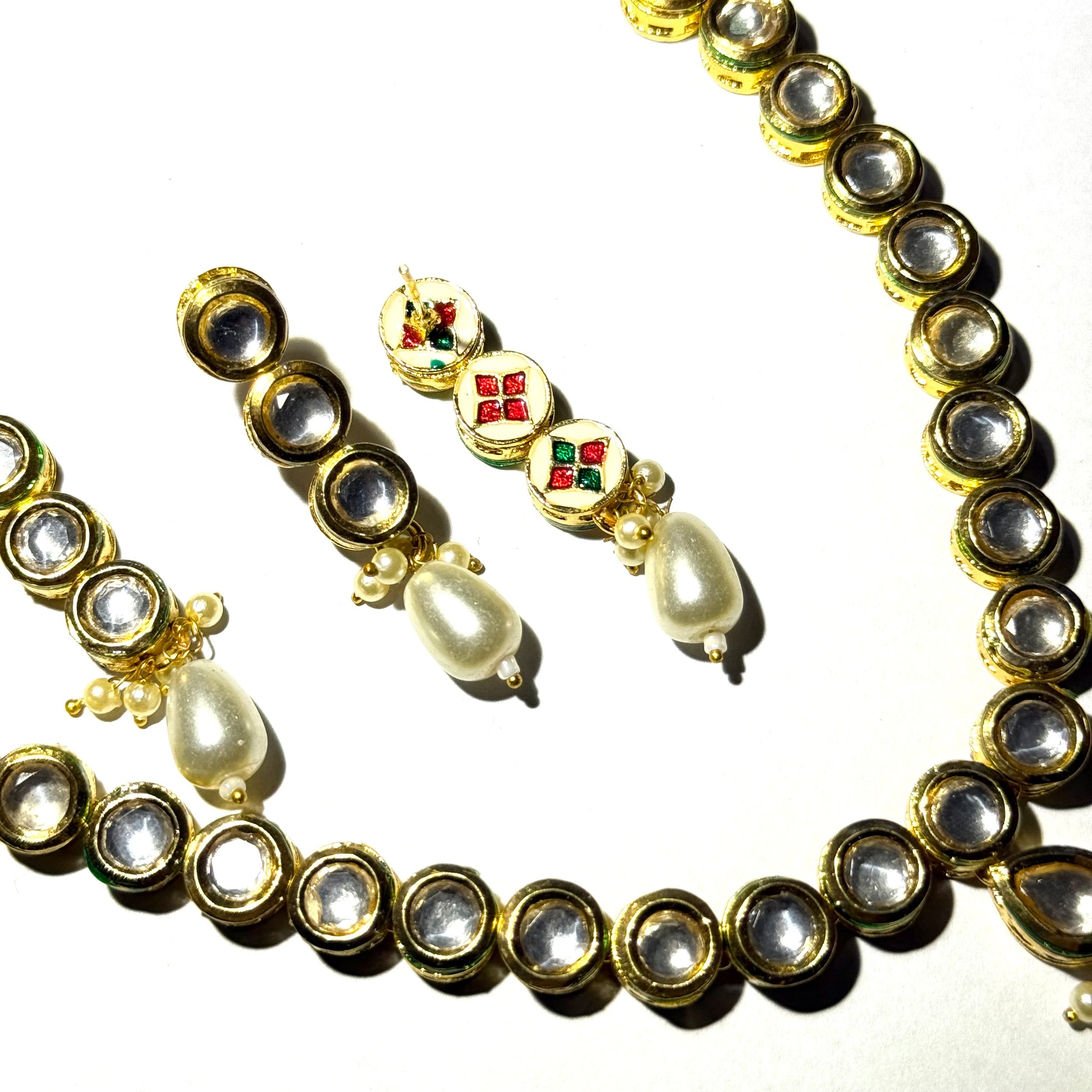 This exquisite drop Sheesha Kundan necklace set features dazzling mirror-like Kundan stones intricately arranged in a timeless design. It exudes elegance and grace. Perfect for weddings and festive occasions, this set blends traditional artistry with modern sophistication, making it a statement piece for any ensemble.