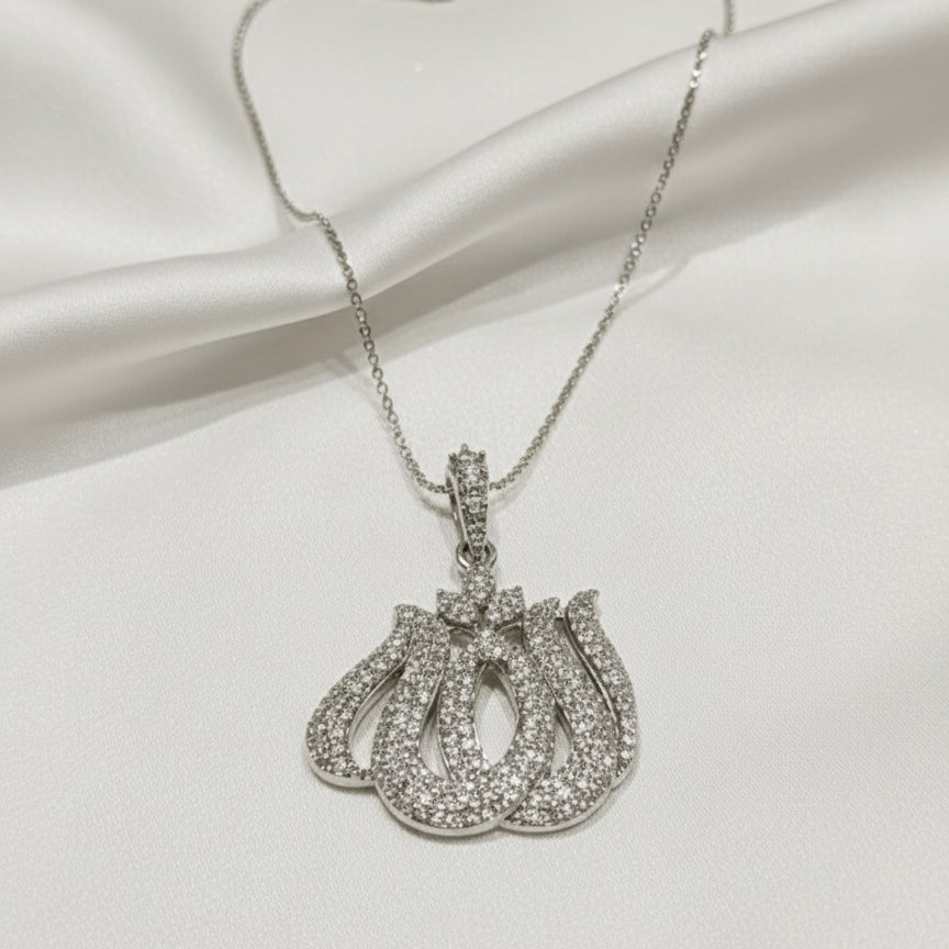 Presenting a captivating gold-plated Allah locket, embellished with shimmering zircons, meticulously set in resilient steel, accompanied by a matching chain. This stunning piece seamlessly blends opulence with spirituality, showcasing the sacred inscription of "Allah" adorned with dazzling zirconia stones, radiating divine beauty. Crafted with attention to detail, the intricate design of the locket exudes elegance and reverence, making it a cherished symbol of faith and style. Paired with a durable stainless steel chain, this exquisite accessory is a timeless expression of devotion and sophistication.