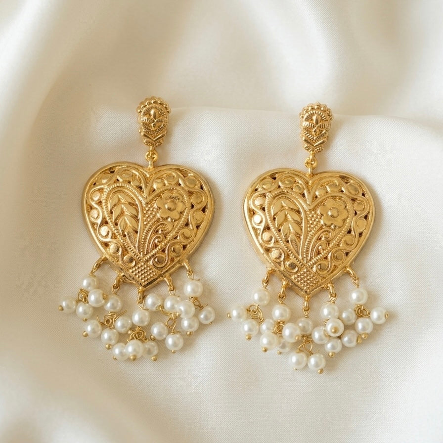 Gracefully crafted to add a touch of elegance to your festive look, these earrings feature a delicate heart-shaped stud paired with intricately designed jhumki drops. Finished in luxurious gold plating and adorned with subtle pearl danglings, they beautifully blend tradition with modern charm. Lightweight yet eye-catching, these earrings are perfect for Eid gatherings, festive celebrations, and special occasions.