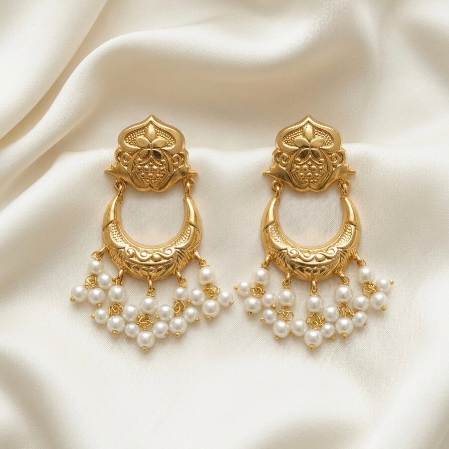 Elegant and timeless, these earrings feature a delicate moon motif beautifully paired with pearl hangings that add graceful movement and charm. Finished with high-quality gold plating, the design reflects the serene glow of moonlight, making it perfect for festive occasions and evening wear.