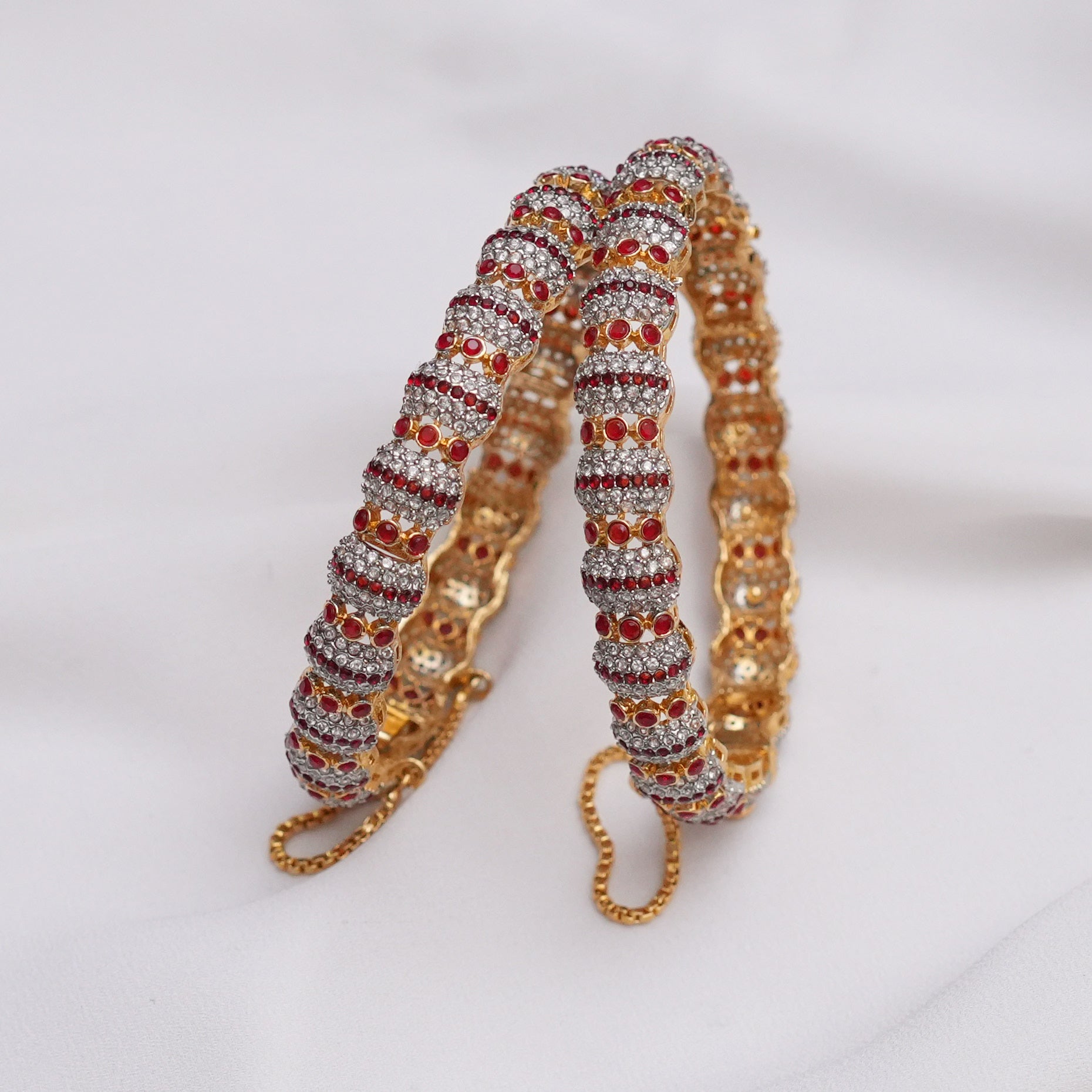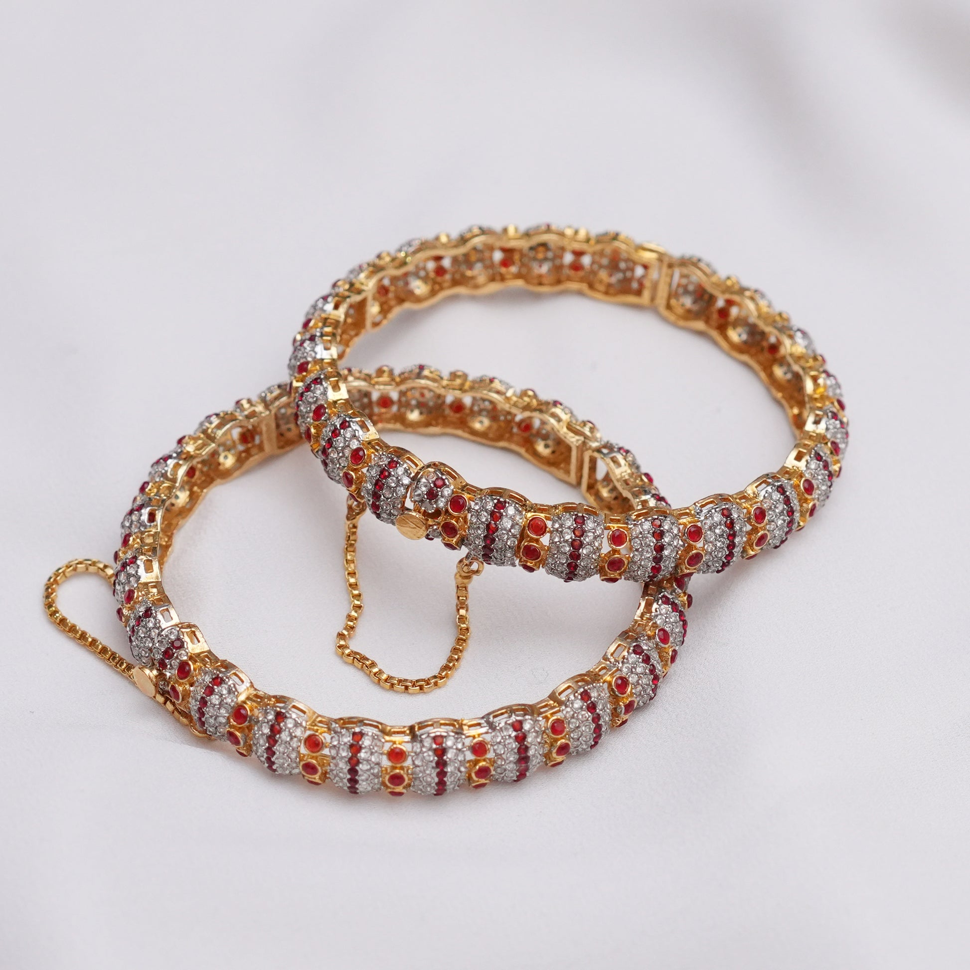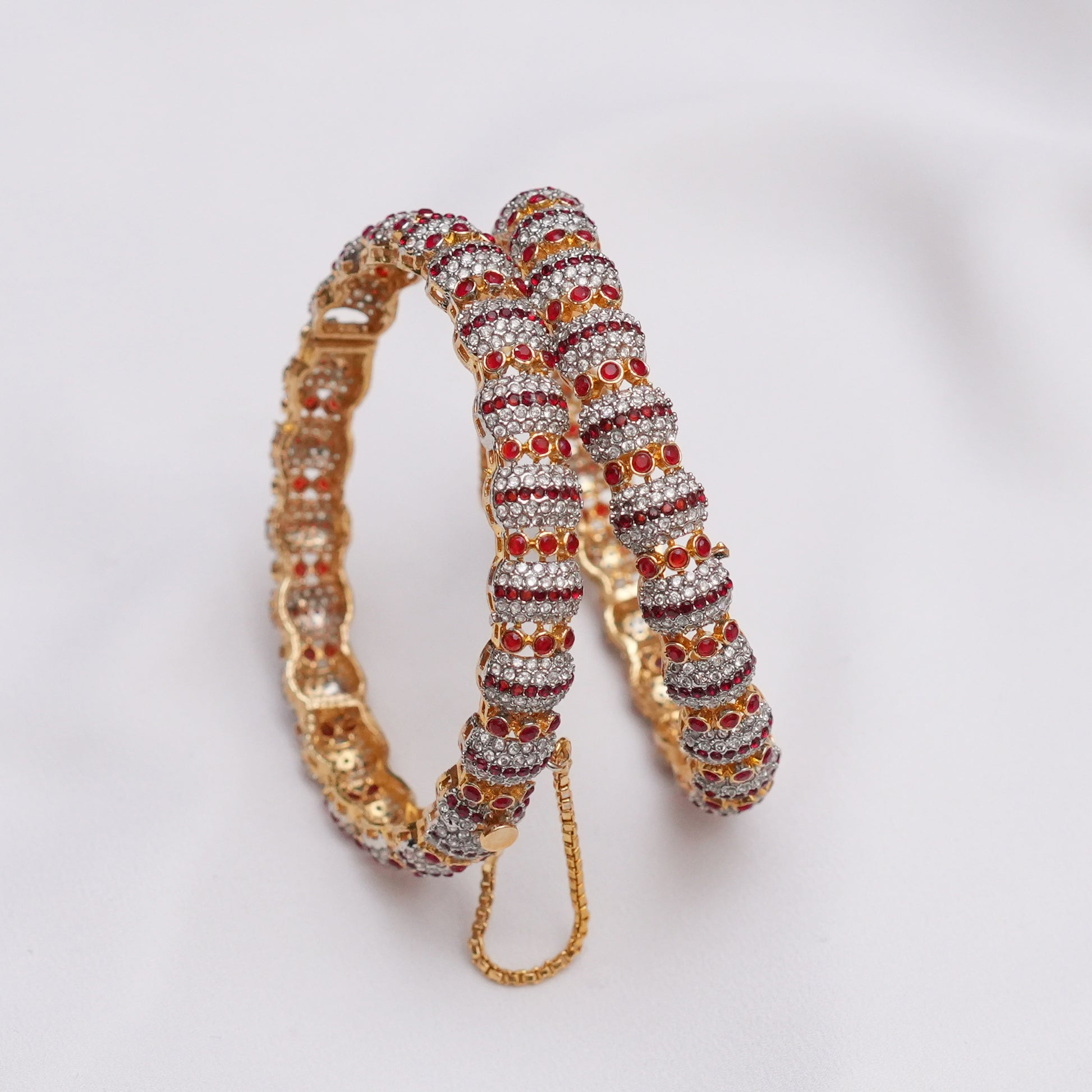 Adorned with radiant rubies set in intricate floral patterns, these bangles offer a luxurious touch of sophistication. The openable design ensures a comfortable fit, making them perfect for any special occasion.