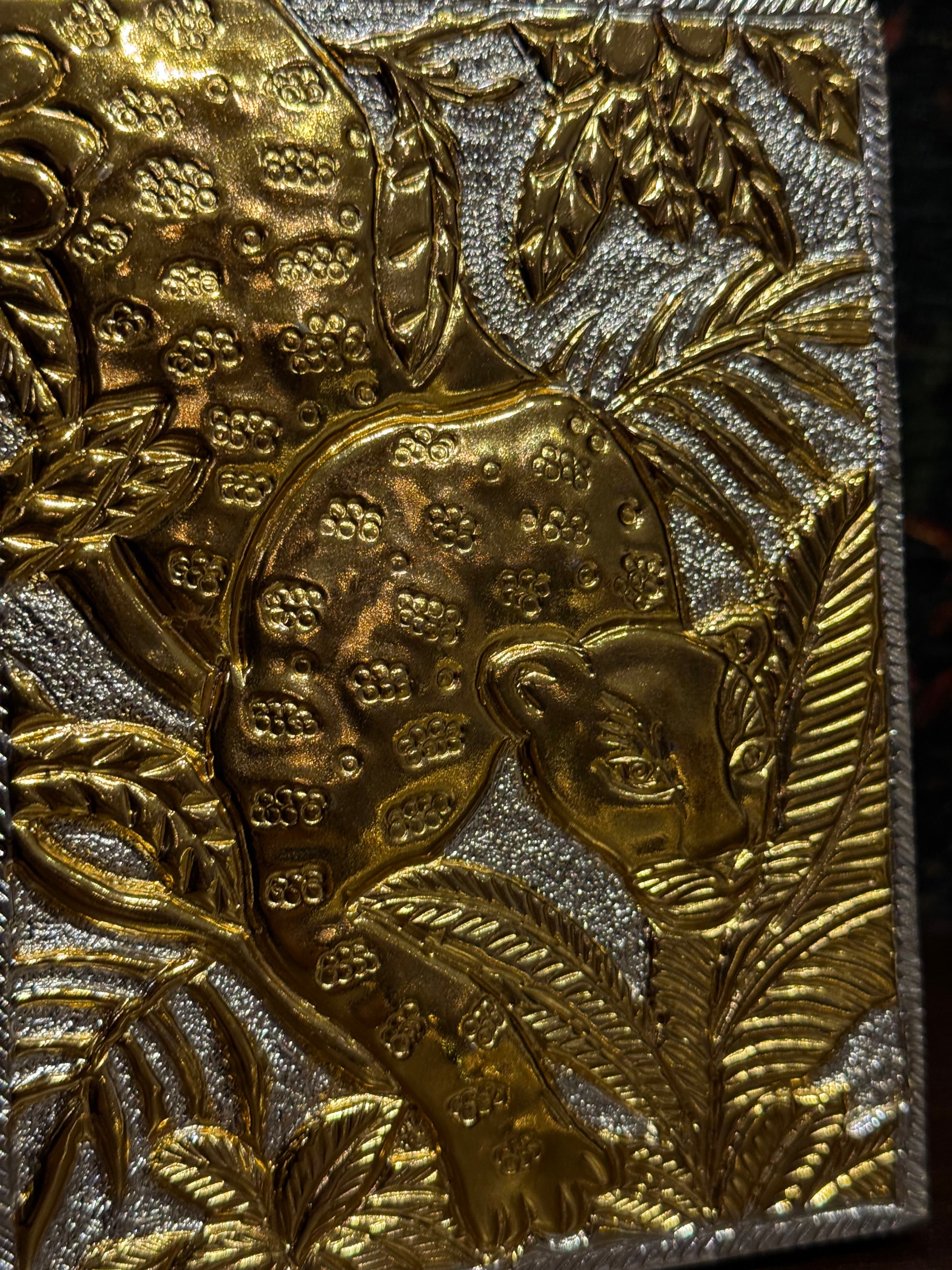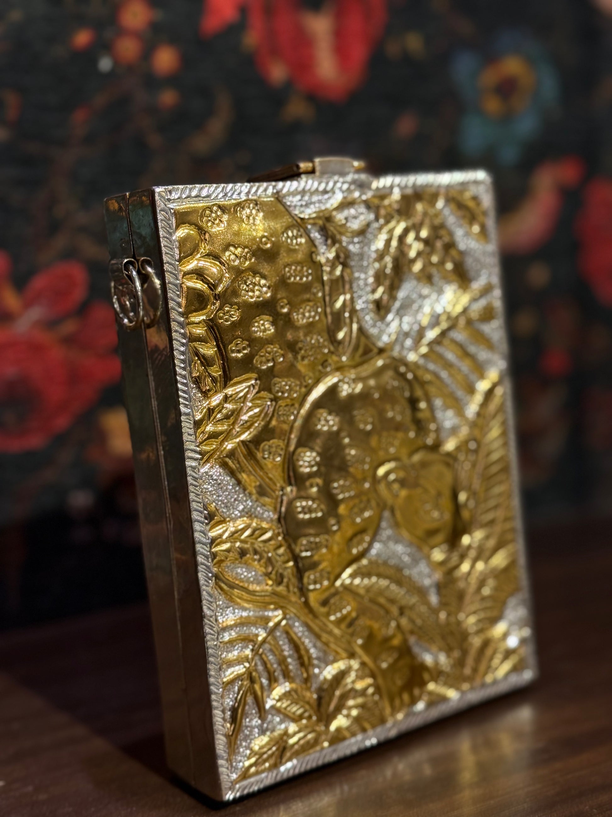 The Zar-e-Jangal collection celebrates the untamed elegance of nature. Each clutch is hand-crafted in brass, gold-plated and meticulously polished, drawing inspiration from leopard grace and jungle mystique.